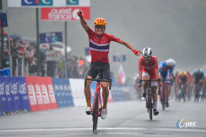 • Jason Tesson a pris ce jeudi matin à Plouay la 6ème place des championnats d'Europe Espoirs. Le champion de France est notamment devancé par le nouveau champion, le Norvégien Jonas Hvideberg qui finit légèrement détaché sous la pluie. Alexis Renard a pris la 40ème place. Hvideberg vient de prendre la 2ème place de son championnat national élite et il est membre de Uno-X Pro Cycling Team.
