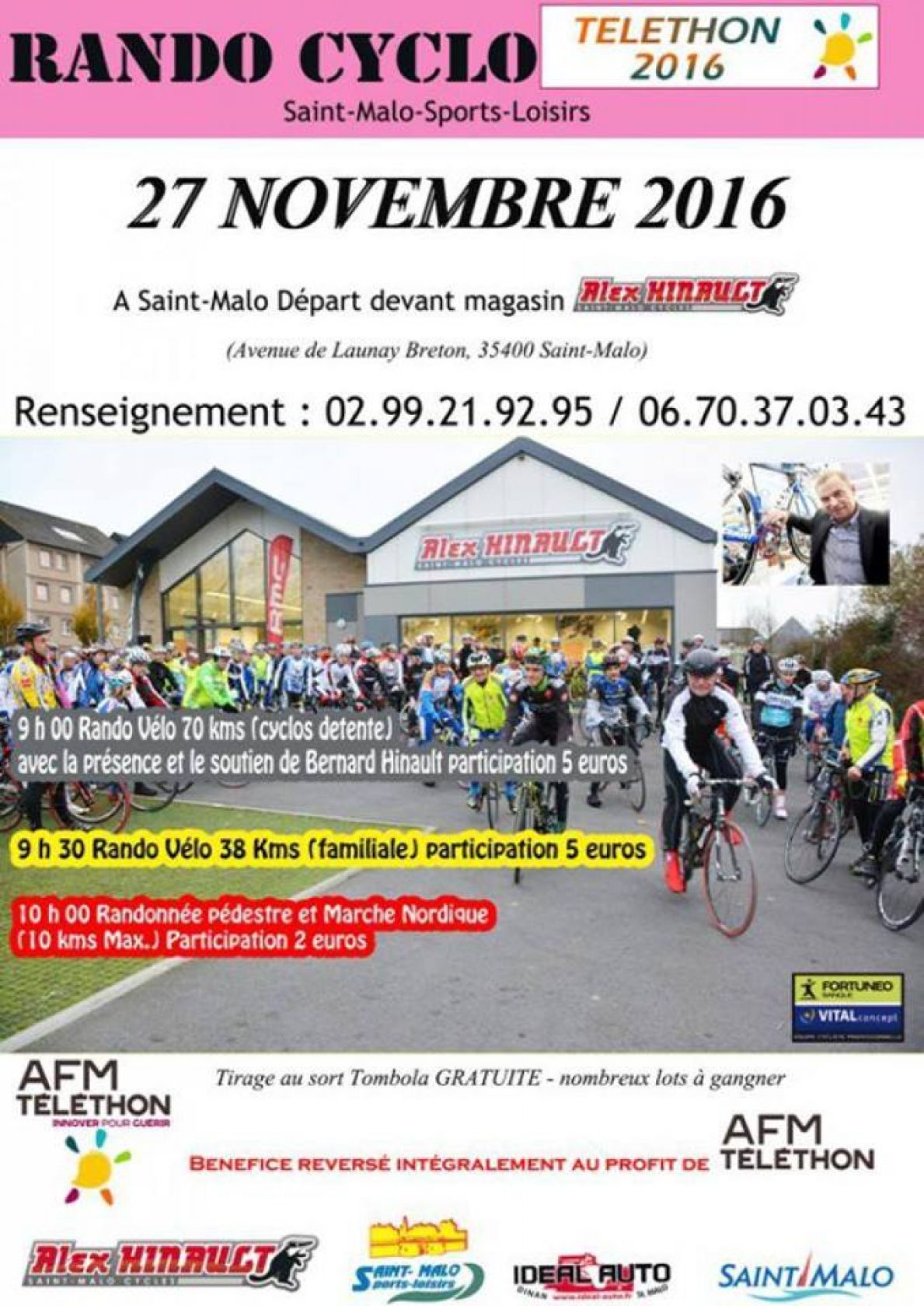 Ce dimanche, à Saint-Malo, aura lieu une nouvelle édition de la rando du téléthon avec la présence de Bernard Hinault. Départ des cycles Alex Hinault à 09h pour les 70km ou à 09h30 pour les 38 km de la rando familiale. Les marcheurs ne sont pas oubliés avec un parcours de 10km. La participation est de 5. Tous les bénéfices sont reversés à AFM Téléthon. A noter, la tombola gratuite avec de nombreux lots à gagner !