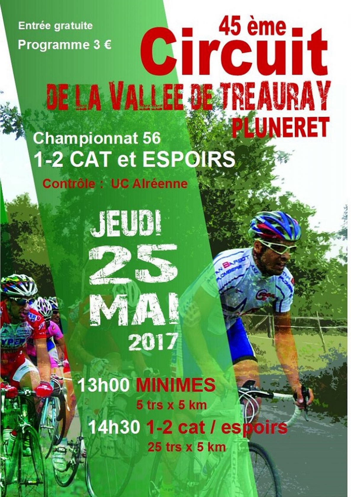 Le championnat du Morbihan 1-2 et espoirs qui se déroule le jeudi 25 mai prochain , il est ouvert aux coureurs de 1ère catégorie des autres départements. C'est la seule course ouverte aux 1ères dans la région , le jeudi de l'Ascension.